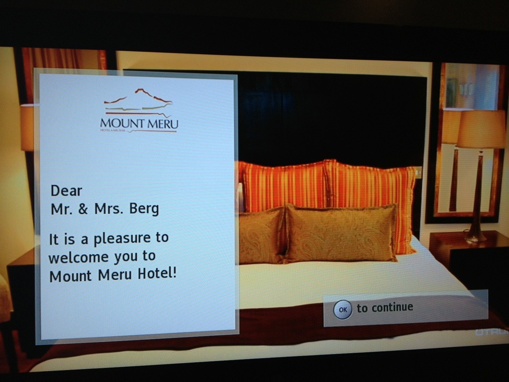 Da har vi sjekket inn på hotell Mount Meru i Arusha. Og gjett om vi ble overrasket da vi kom på hotellrommet!