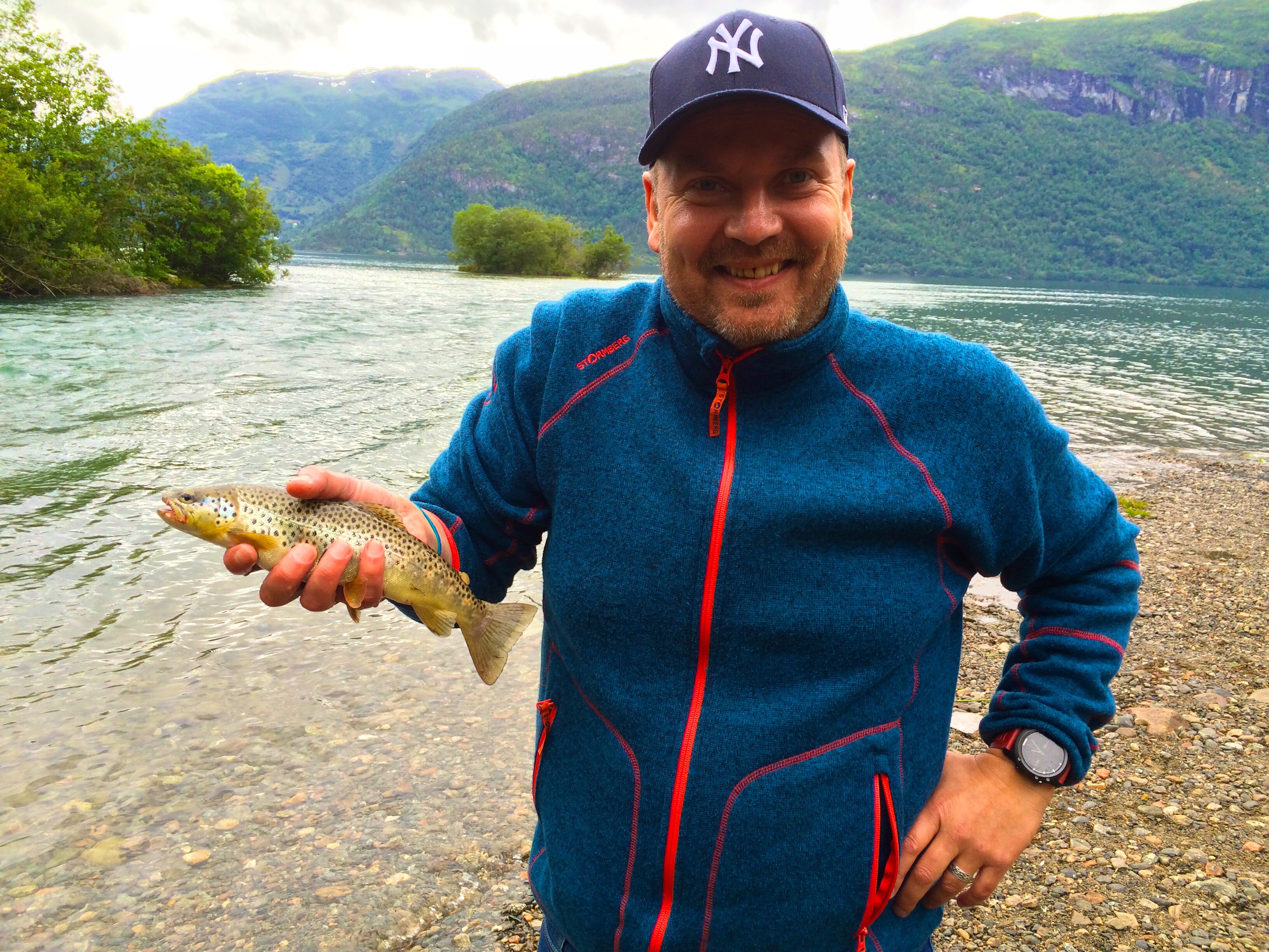 Etter ca 100 kast satt den, dvs ørreten på hele 300 gram fikk seg litt frisk luft før den fikk svømme videre.