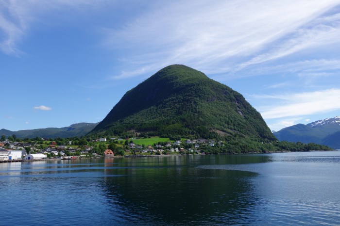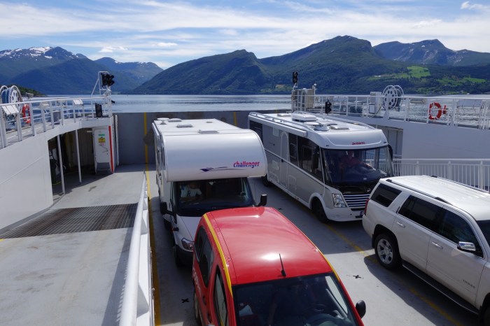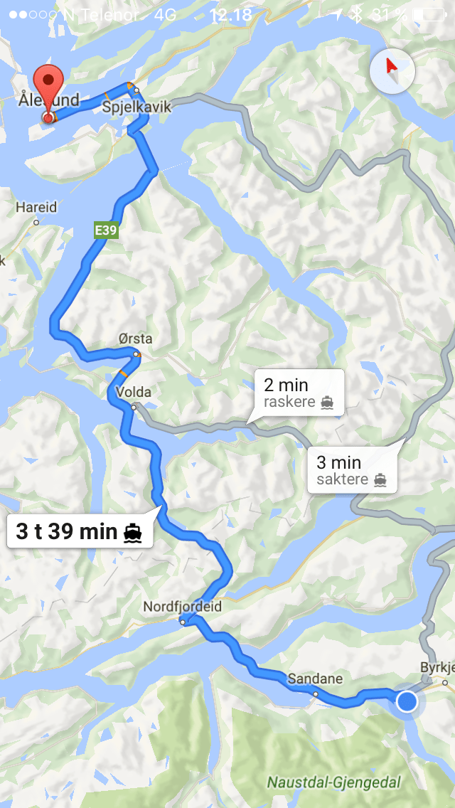 Kjøreturen var utrolig fin, langs bygd og by, innom flere kjente plasser som vi bare har sett på værkartet. Sandane, Norfjoreid, Volda, Ørsta osv. På turen var det tre korte ferger og tro det eller drit i det, vi kjørte rett ombord på alle tre fergene. 🙂
