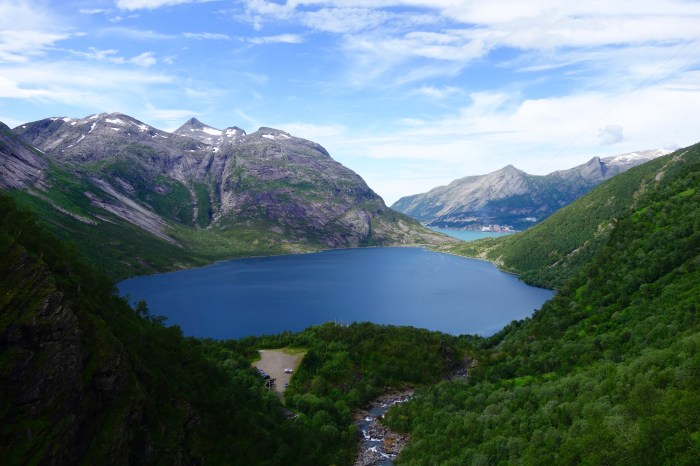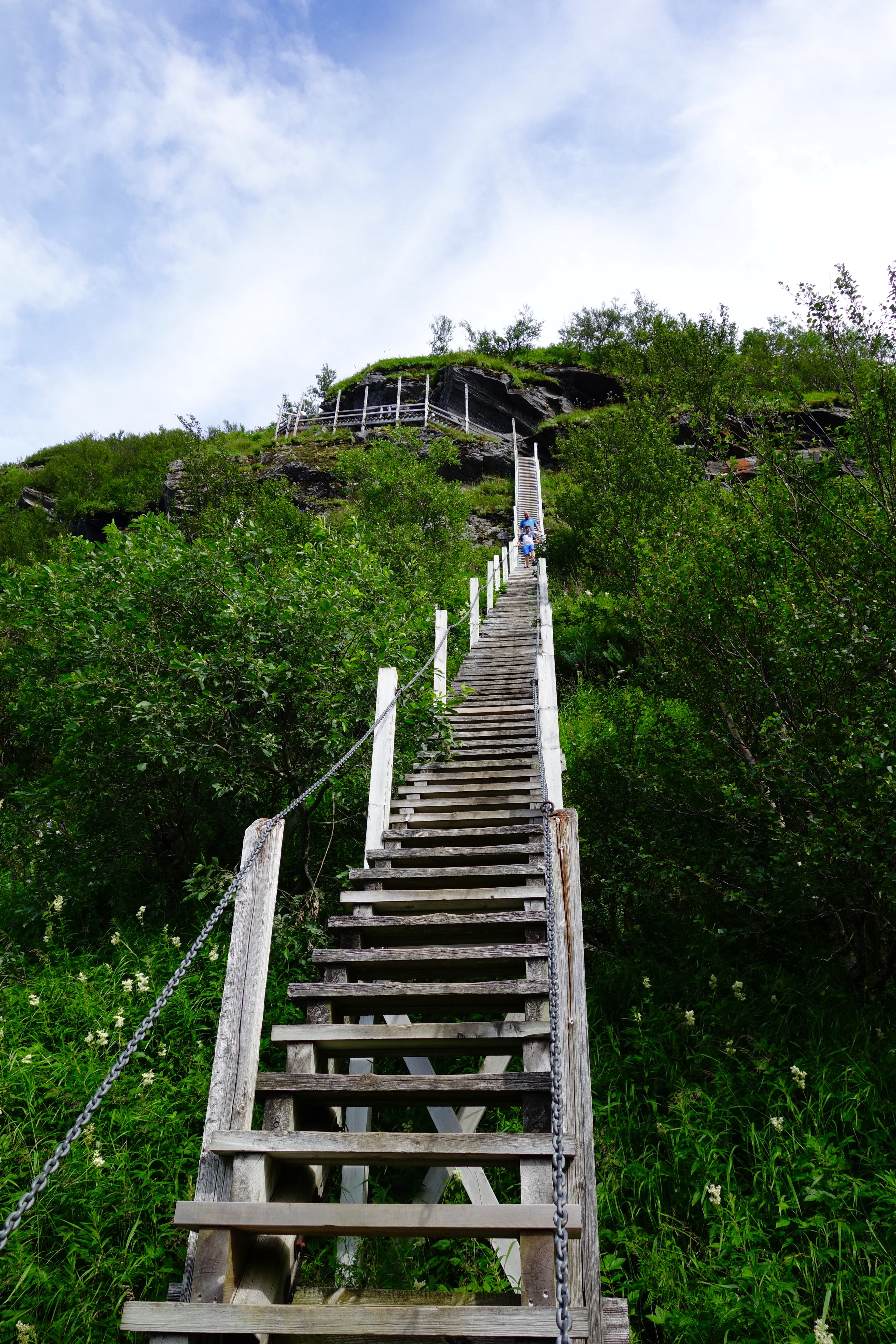 Like før Glomfjord ligger det et demningsanlegg som ble bygd tidlig på nittenhundretallet og som er med på å gi vann til kraftverket som igjen gir strøm til aluminiumsproduksjonen i Glomfjord. Her er det bygd trapper opp til demningene. Og for å stige trehundre meter opp trengs det 1129 trapper. Disse skulle vi opp.