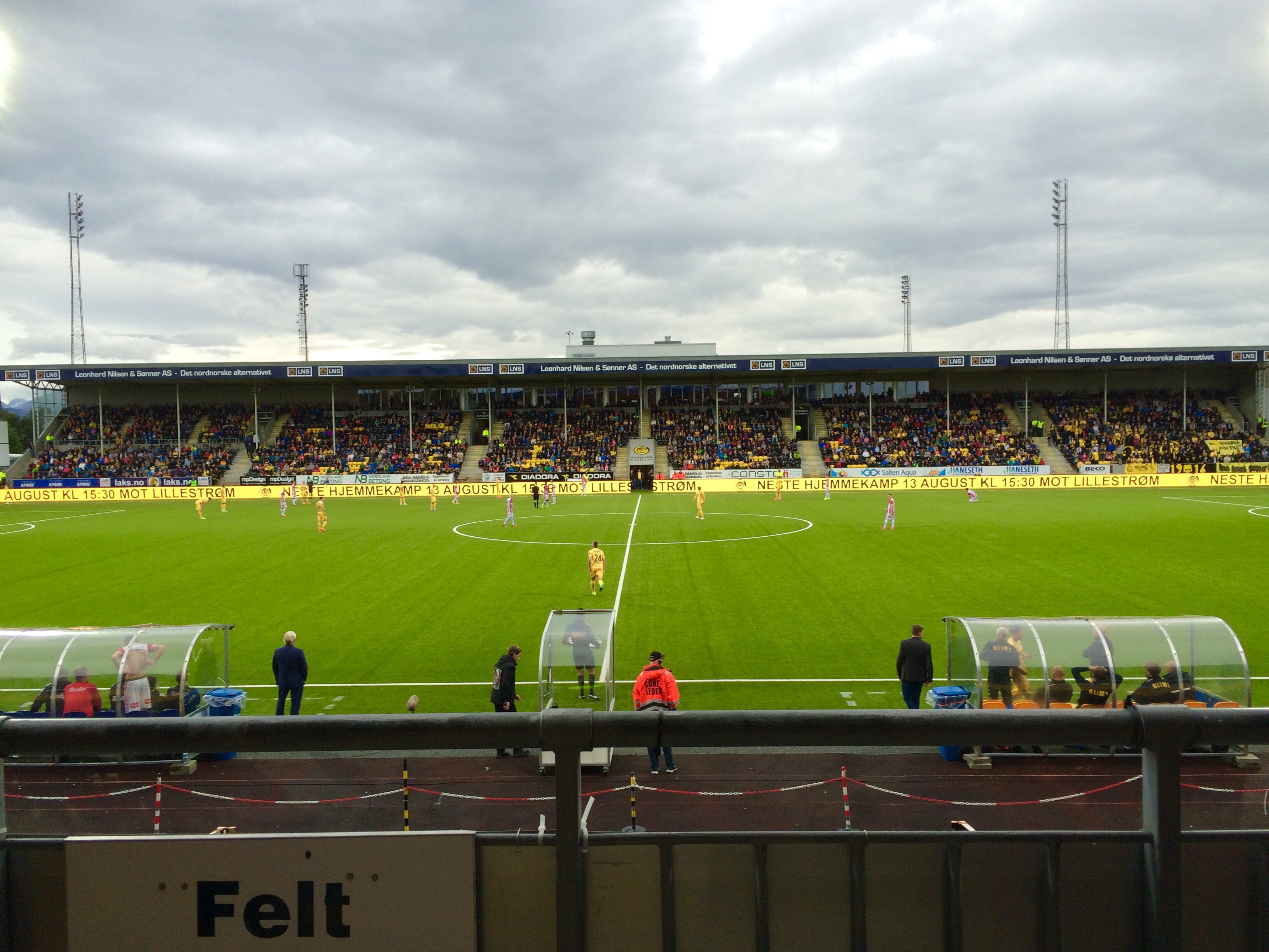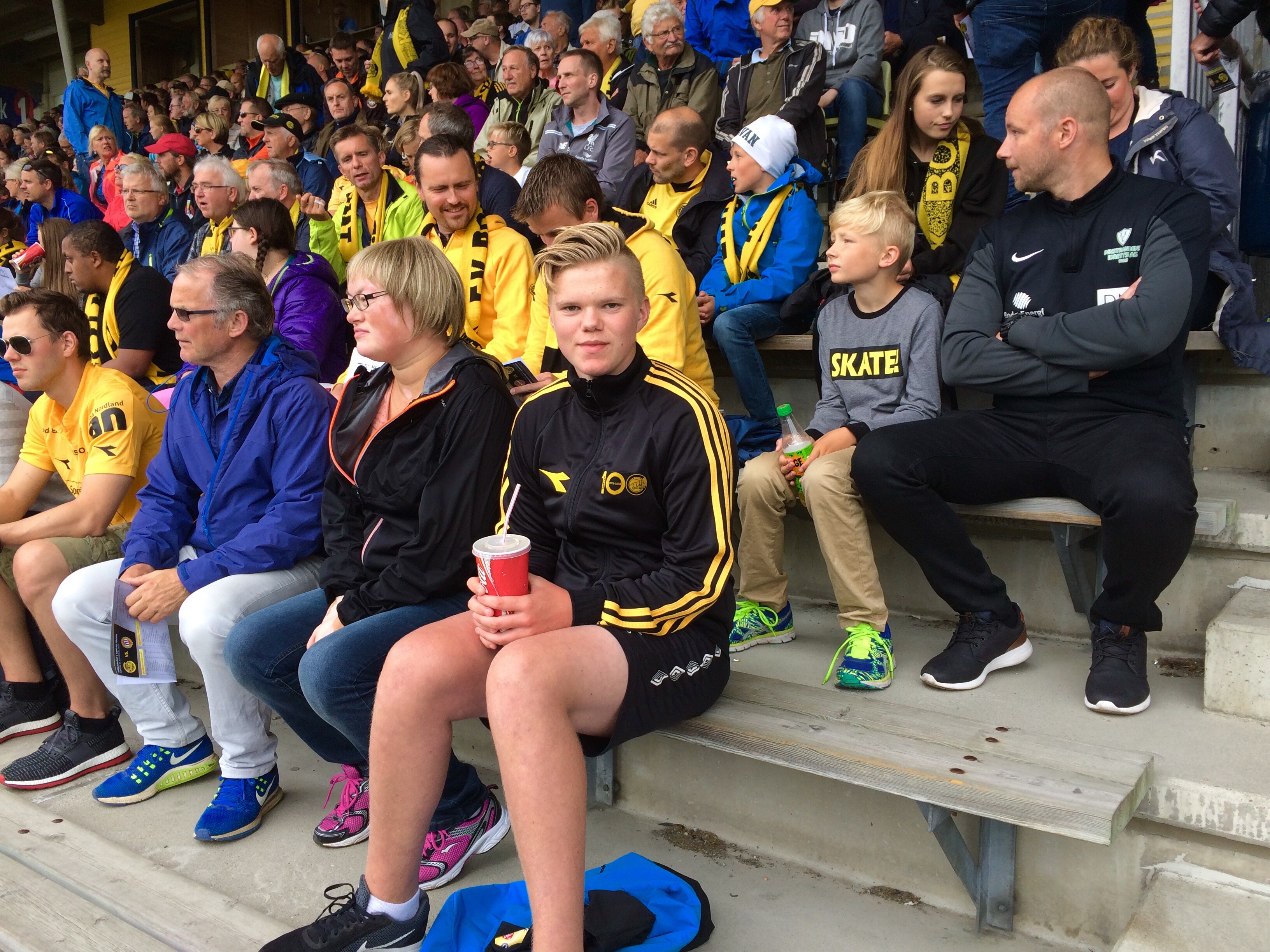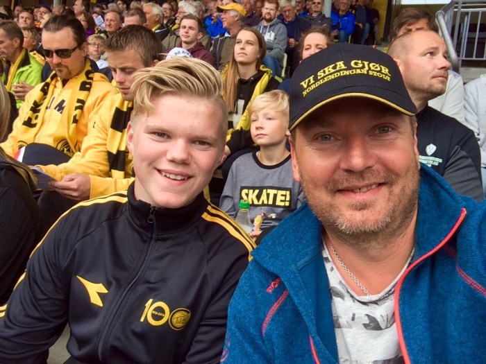 Herr Berg og Junior kjørte så inn til byen og gikk på fotballkamp. Vi måtte da som seg hør og bør kle oss opp med supportereffekter. Så det ble caps på far og jakke på Junior. Så var det bare å rope heia Glimt. Kampen var mellom Bodø/Glimt og Tromsø, med a andre ord; Slaget om Nord-Norge!