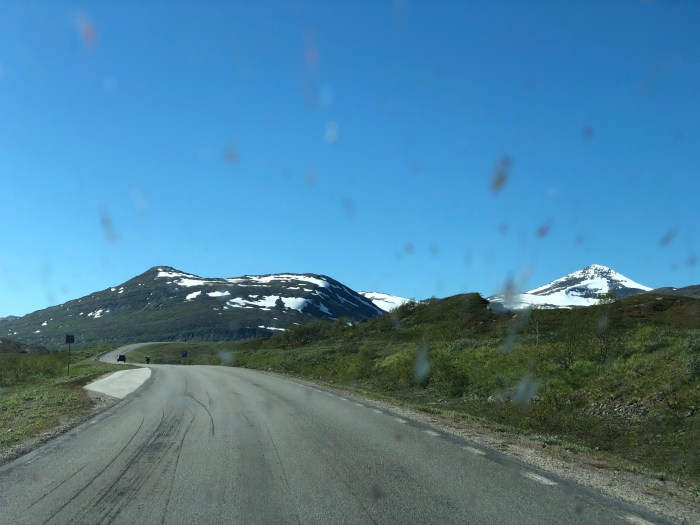 Vi merket godt når det nærmet seg Norskegrensen. De karakteristiske høye fjellene dukket opp i horisonten med snø liggende på skyggesidene. Vi kom ned Junkerdalen og inn på E6 rett nord for Saltfjellet.